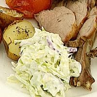 Finsnitt kål og rødløk og vend inn i yoghurten. Smak til med salt, chili eller kajennepepper og sukker. La salaten stå og trekke smak ca 1 time før servering. Denne salaten smaker godt til grillet kjøtt og fisk, røkt makrell, ørret/laks eller sild.